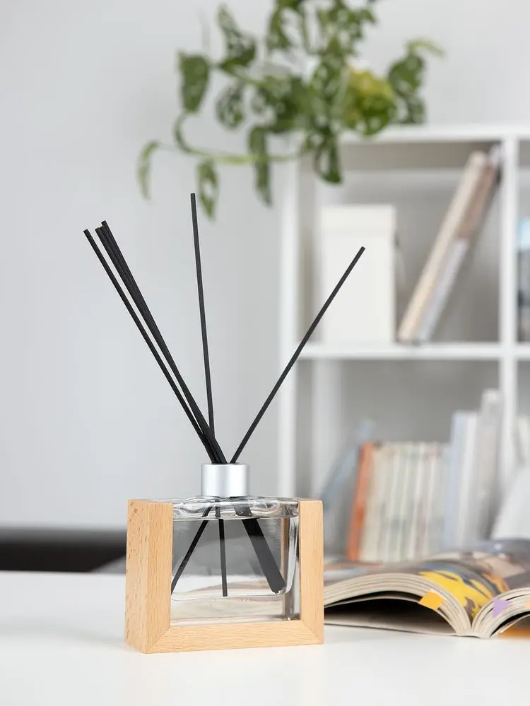 Изящный стеклянный флакон в обрамлении натурального дерева станет стильным элементом декора.