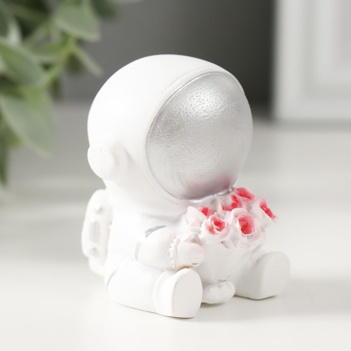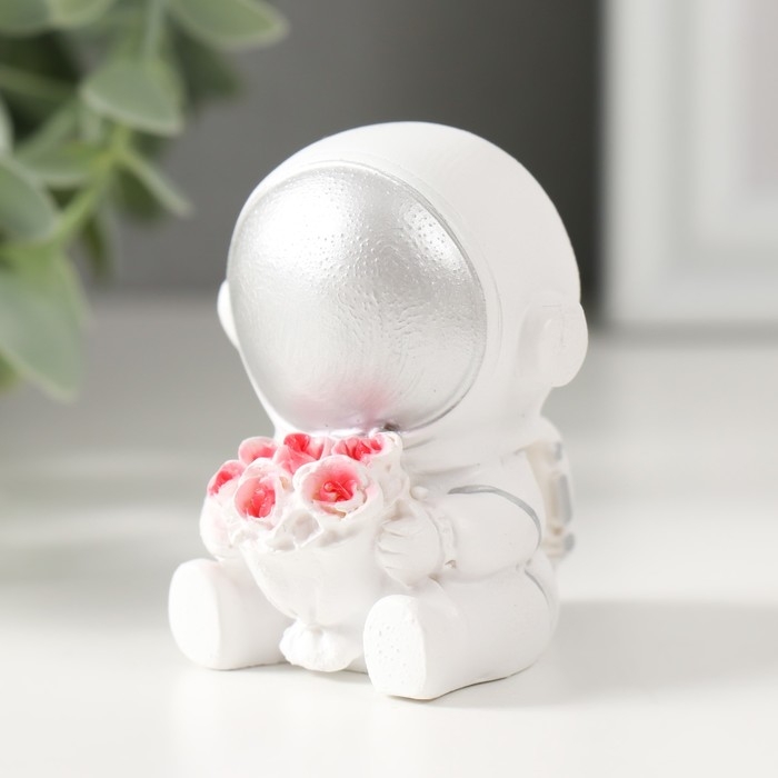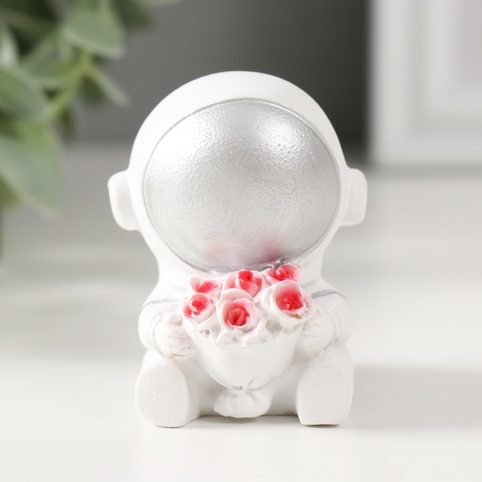 Сувенир полистоун "Астронавт в белом скафандре с серебряным шлемом с букетом роз" 6х5х4,5 см 68549