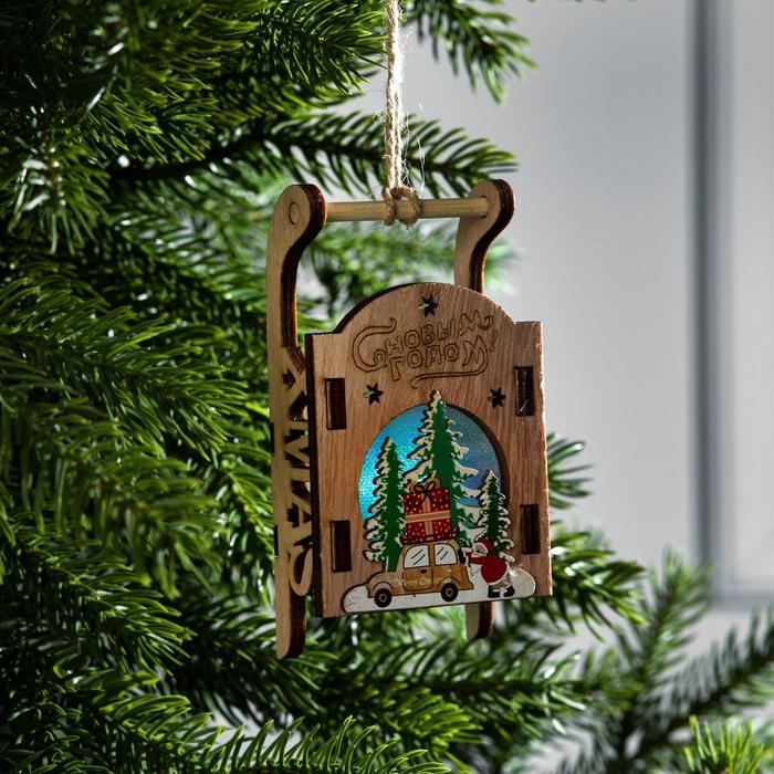 Ёлочная игрушка «Сани с Дедом Морозом и машиной», от батареек, свечение RGB