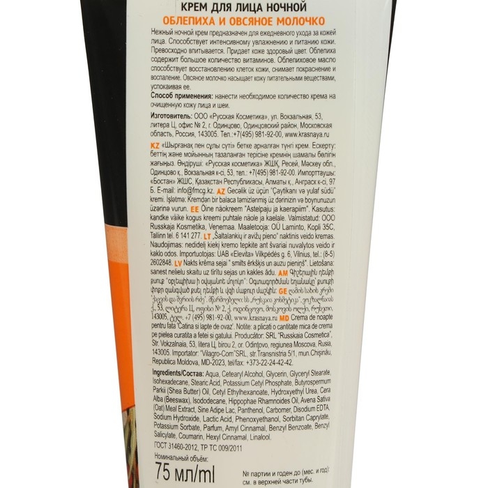 Нежный ночной крем предназначен для ежедневного ухода за кожей лица. Способствует интенсивному увлажнению и питанию кожи. Превосходно впитывается. Придает коже здоровый цвет. Облепиха содержит большое количество витаминов. Облепиховое масло способствует восстановлению клеток кожи, снимает покраснение и воспаление. Овсяное молочко насыщает кожу питательными веществами, успокаивая ее.