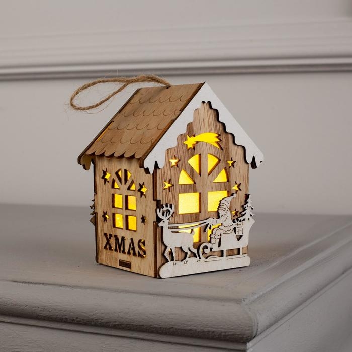 Ёлочная игрушка «Домик с Дедом Морозом на санках», от батареек, свечение тёплое белое