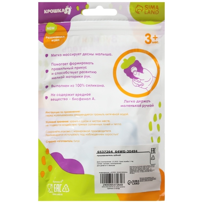Форма ручки и размеры разработаны специально для детской ладони, поэтому малышу будет удобно её держать. Рельефная структура на поверхности изделия и его дополнительных элементов будет способствовать развитию мелкой моторики, а яркие цвета — формированию визуального восприятия мира.