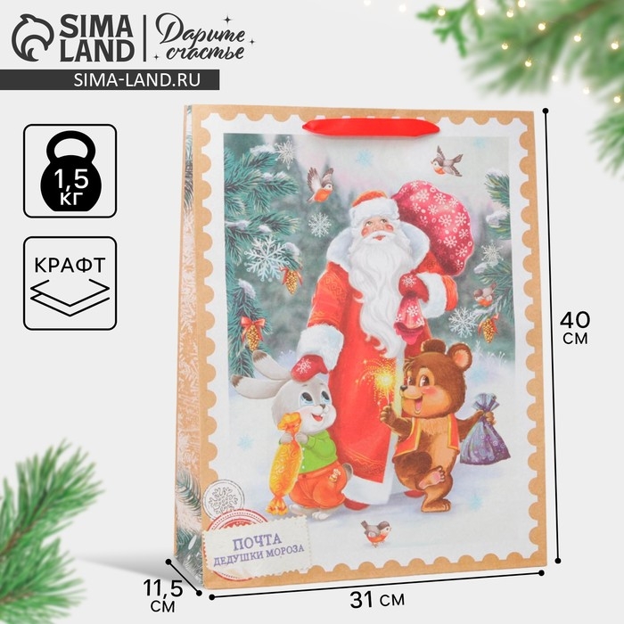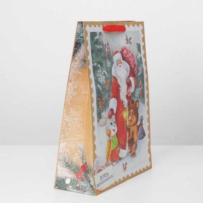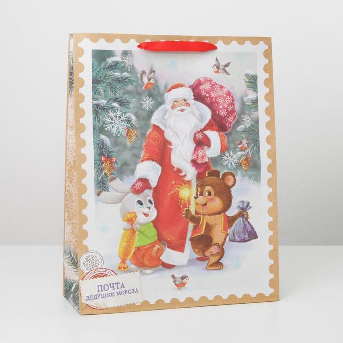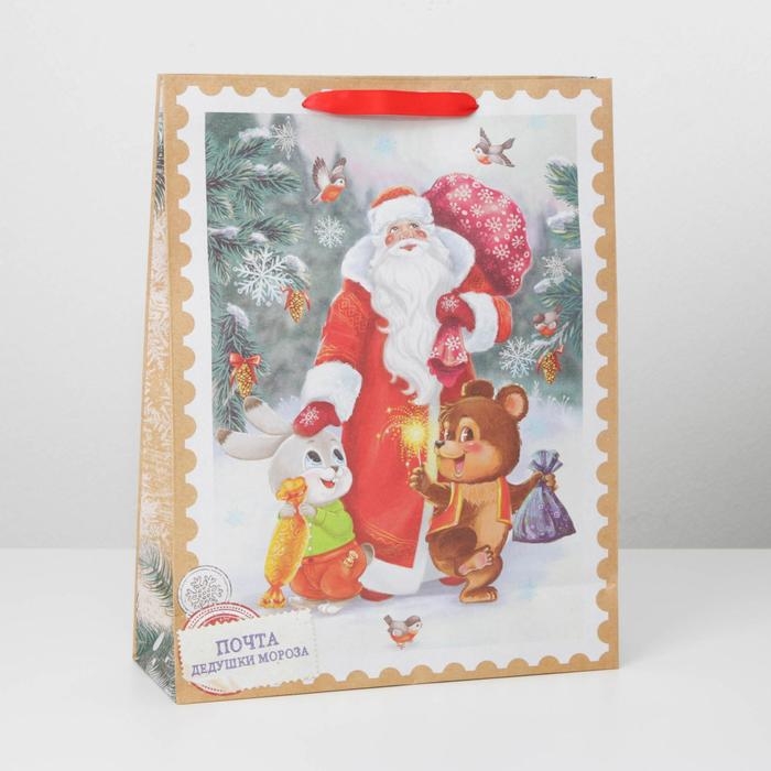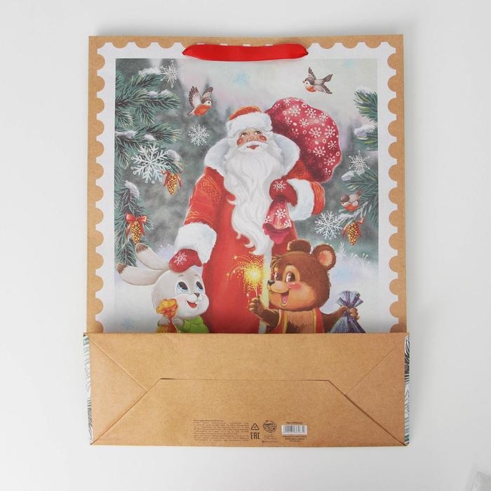 Пакет подарочный новогодний крафтовый вертикальный «Дедушка мороз и зверята», L 31 х 40 х 11.5 см, Новый год