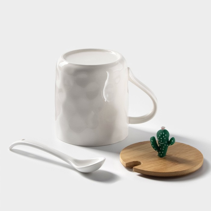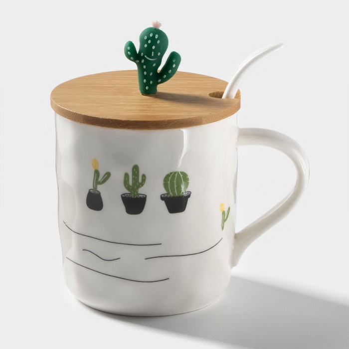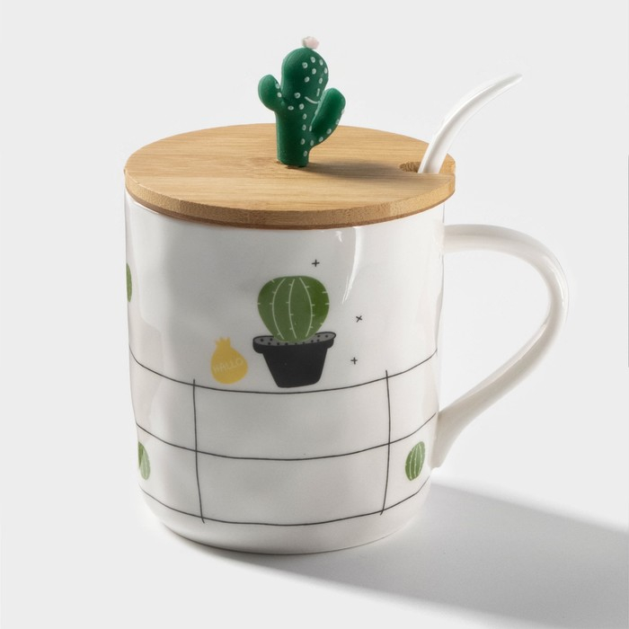 Кружка керамическая с деревянной крышкой и ложкой «Кактус», 380 мл, цвет МИКС