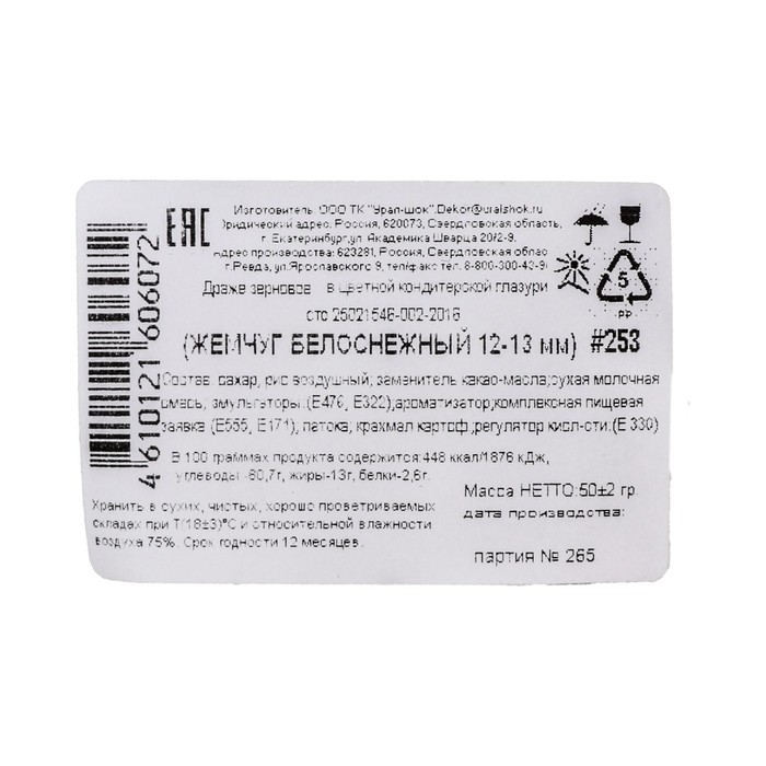 Кондитерская посыпка с мягким центром "Жемчуг", белоснежная, 12-13 мм, 50 г