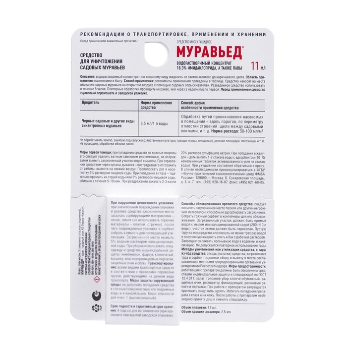 Инструкция, рекомендации по хранению, применению и транспортировке, техника безопасности подробно указаны на упаковке. Купить Муравьед можно в компании Газоновком оптом и в розницу с оперативной доставкой по Москве, Московской области и во все регионы России. Препарат имеет полный пакет документов (сертификат, паспорт безопасности, декларация), разрешающих продажу данного средства в РФ.