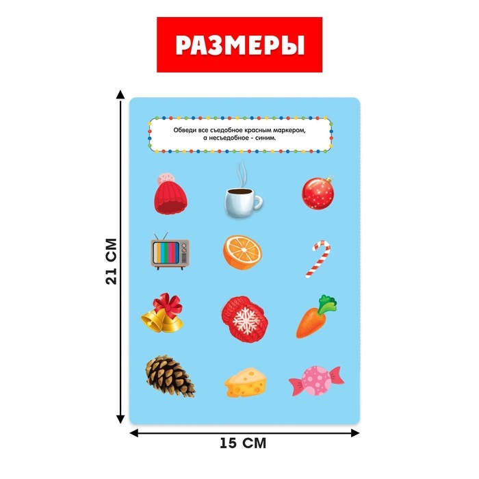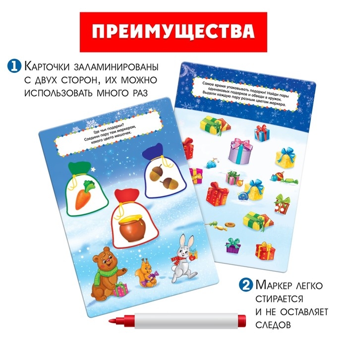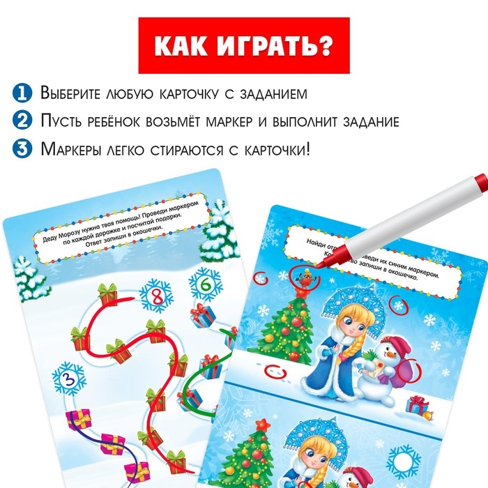 Набор включает в себя карточки с заданиями и цветные маркеры, ими можно писать и стирать сколько угодно.