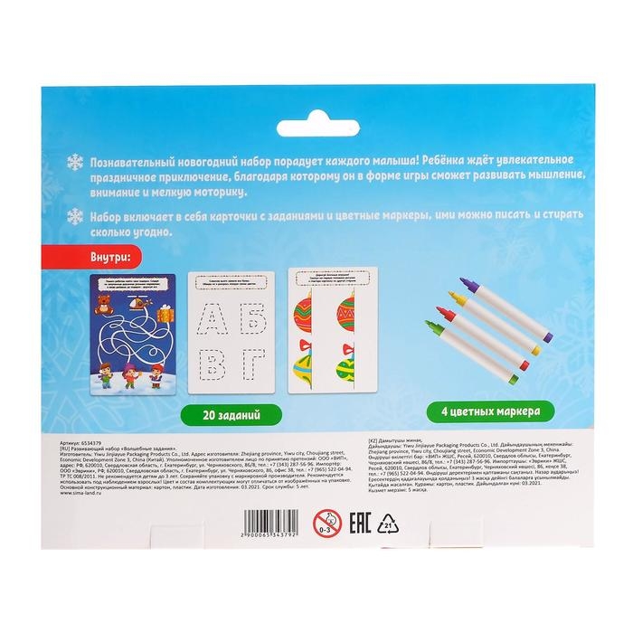 Развивающий набор «Волшебные задания» порадует малыша. Его ждёт настоящее праздничное приключение! В процессе выполнения заданий ребёнок потренирует мышление, внимание и мелкую моторику.