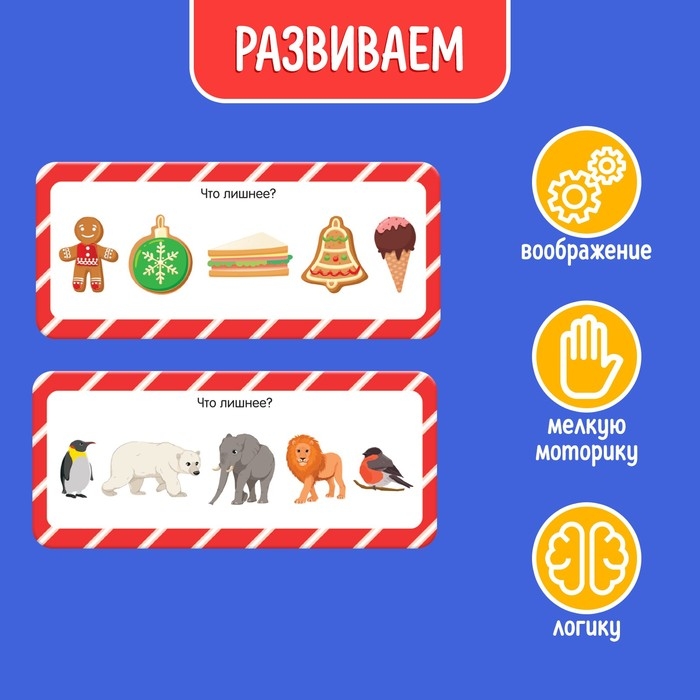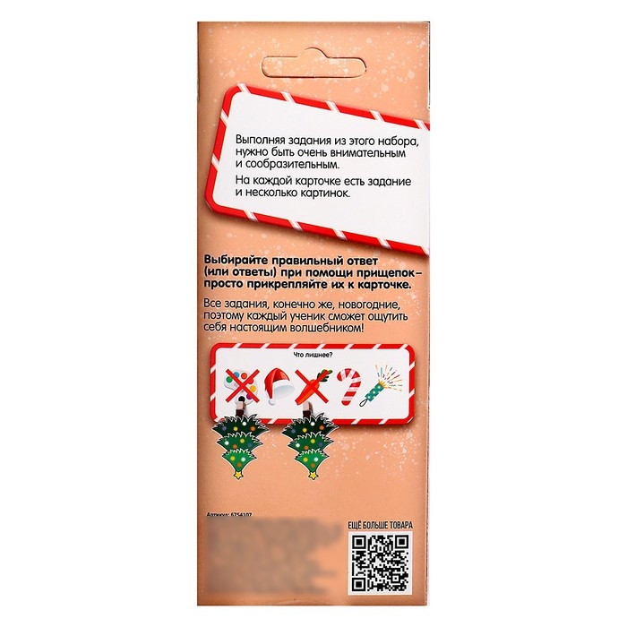 Новогодние задания поднимут праздничное настроение крохе! Выполняя задания из этого набора, нужно быть очень внимательным и предусмотрительным. На каждой карточке есть задание из нескольких картинок. Ребёнку необходимо будет выбрать правильный ответ (или несколько) и с помощью прищепок прикрепить его/их к карточке.