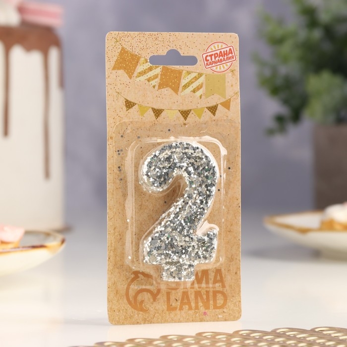 Свеча в торт «Блестки», цифра "2", серебро, 6.5х4