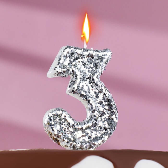 Свеча в торт «Блестки», цифра "3", серебро, 6.5х4