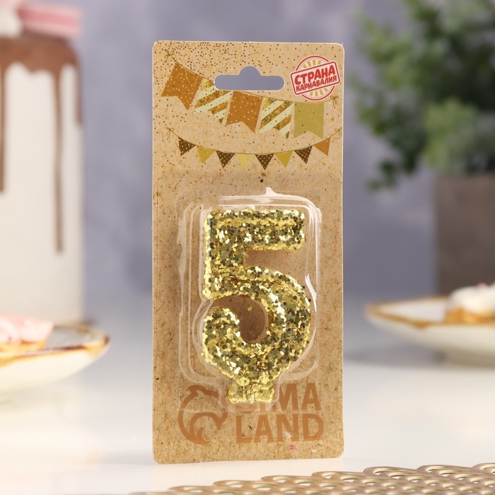 Свеча в торт «Блестки», цифра "5", золото, 6.5х4