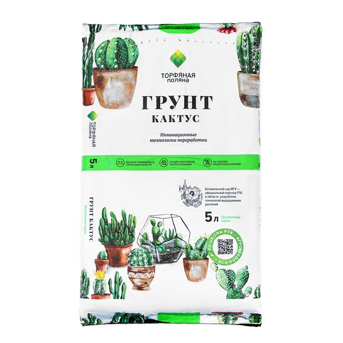 нейтрализатор кислотности. Питательные вещества в форме доступной для растений: азот (NH4 + N03) 90 мг/л; калий (К20) 120 мг/л фосфор (₽205) 150 мг/л. Песок, не менее 10%. Состав торфяного грунта полностью соответствует требованиям, предъявляемым к почве для кактусов - он имеет легкую рыхлую текстуру, хорошо пропускает воду, обогащен минеральными веществами. Субстрат используют для посева семян, укоренения черенков и отпрысков, посадки/пересадки кактусов.