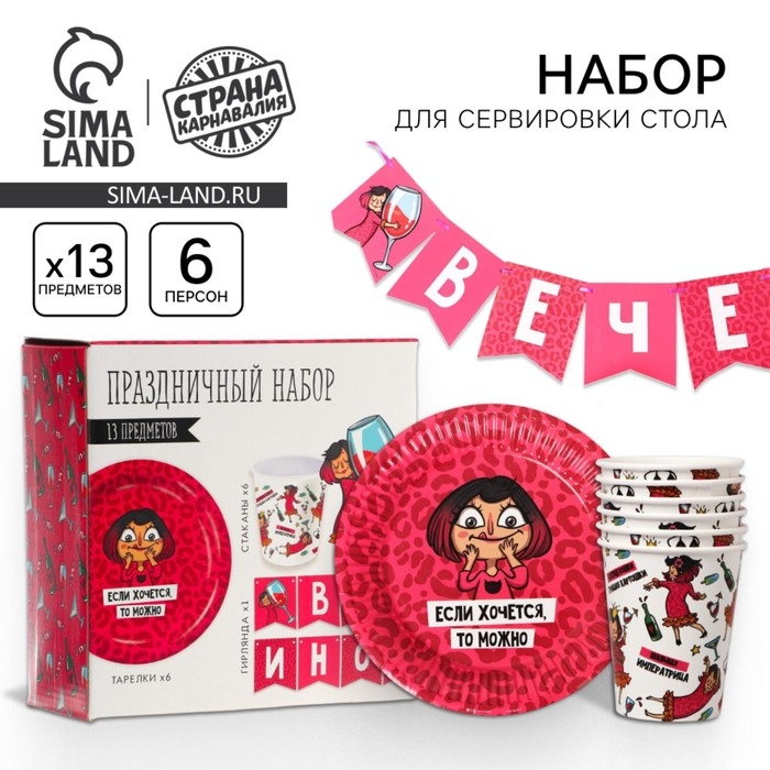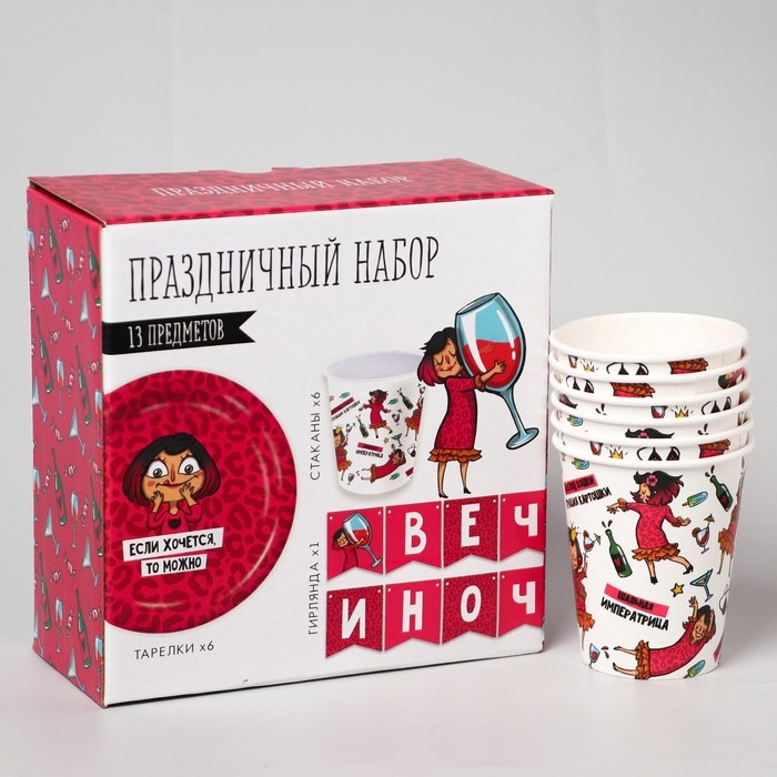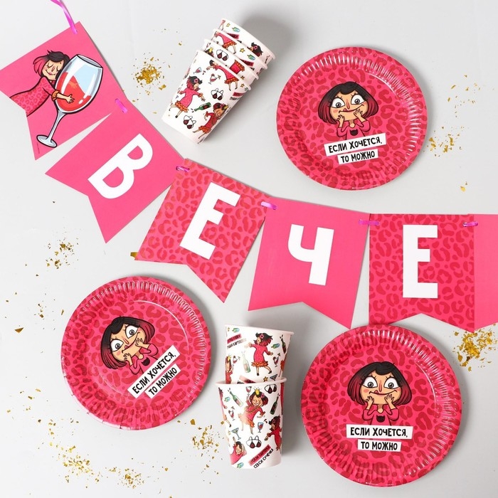 Набор бумажной посуды одноразовый Вечериночка», 6 тарелок, 6 стаканов, 1 гирлянда