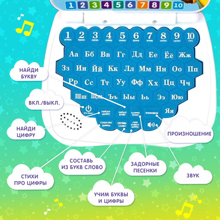 «Умный компьютер» — это увлекательная развивающая игрушка, которая познакомит малыша с алфавитом, цифрами, основами счёта, правописания и логики, а также развлечёт стихами. Детский гаджет способствует улучшению памяти, логического мышления, цветового и звукового восприятия.
