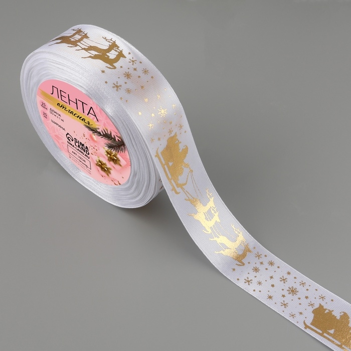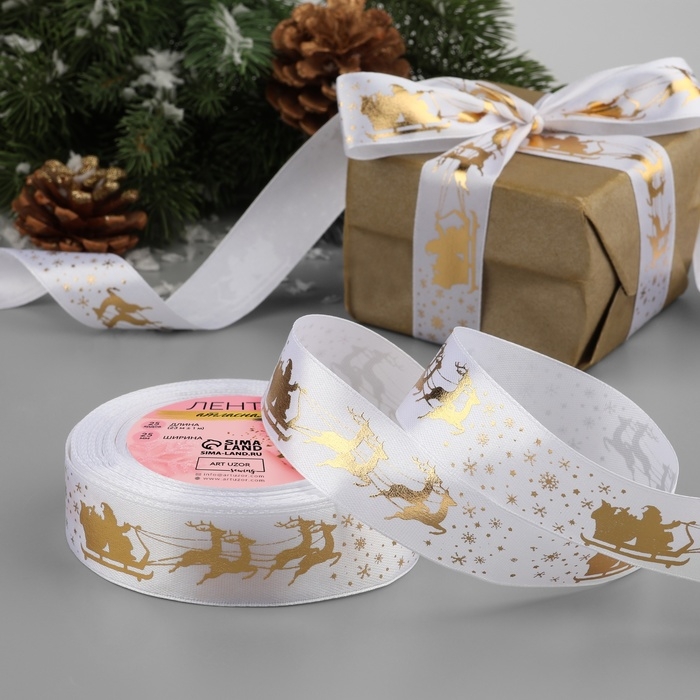 Новый год! Лента атласная с тиснением «Олени в упряжке», 25 мм, 23 ± 1 м, цвет белый/золотой №01