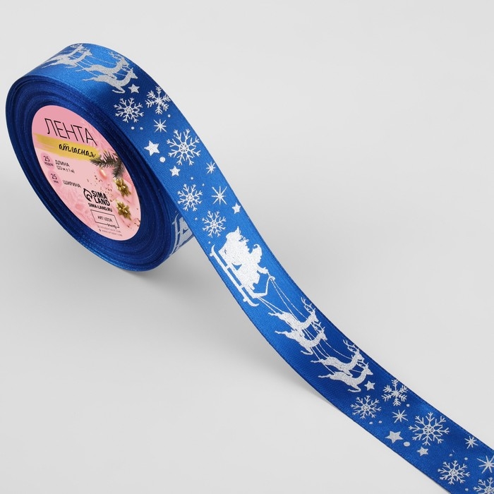 Новый год! Лента атласная с тиснением «Олени в упряжке», 25 мм, 23 ± 1 м, цвет синий/серебряный №122