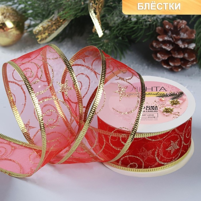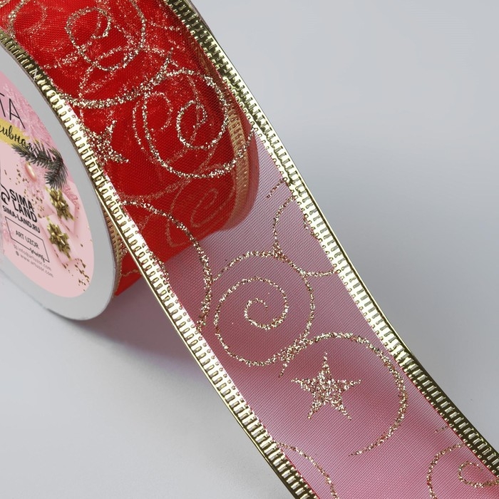 Новый год! Лента капроновая с металлической нитью «Вензеля», 38 мм × 2,7 ± 0,5 м, цвет красный/золотой