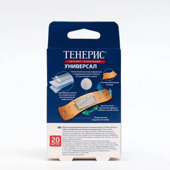 Лейкопластырь бактерицидный основе эластичного перфорированного полимера телесного цвета. Эластичный. Влагоустойчивый. Дышащий. Антисептик - ионы серебра. Антитравматическое покрытие раневой подушечки, 20 шт. 76х19 мм.