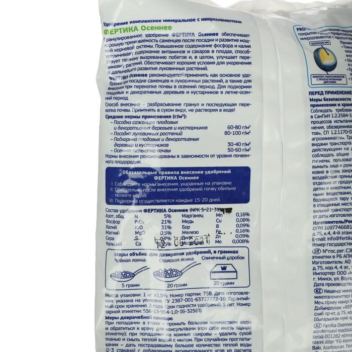Удобрение осеннее «Фертика» содержит сбалансированное количество необходимых растениям питательных веществ. Рекомендуется использовать осенью при перекапывании почвы и для подкормки деревьев и кустарников. Одного пакета достаточно для обработки до 40 м² огорода.