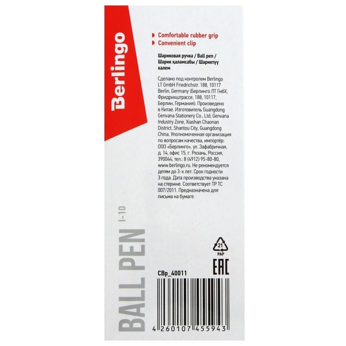 Ручка шариковая Berlingo I-10, черная, 0,4 мм, резиновый упор ЦЕНА ЗА 1 ШТУКУ.