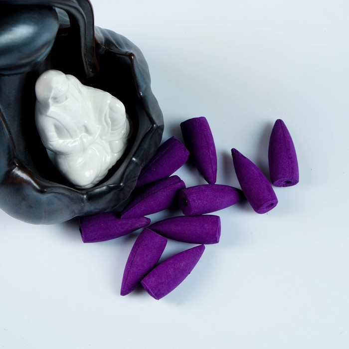 В набор входит 10 конусов и фигурная керамическая подставка. Когда благовония тлеют, дым стелется по основанию фигуры, создавая эффект водопада. Пепел остаётся на подставке и не падает на мебель.
