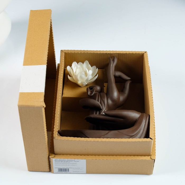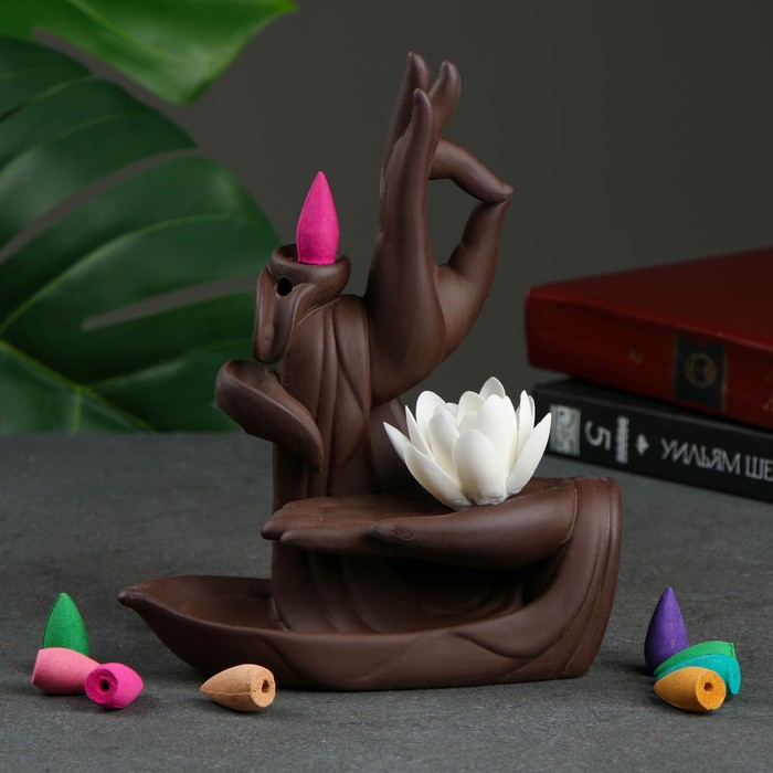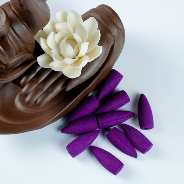 В набор входит 10 конусов и фигурная керамическая подставка. Когда благовония тлеют, дым стелется по основанию фигуры, создавая эффект водопада. Пепел остаётся на подставке и не падает на мебель.