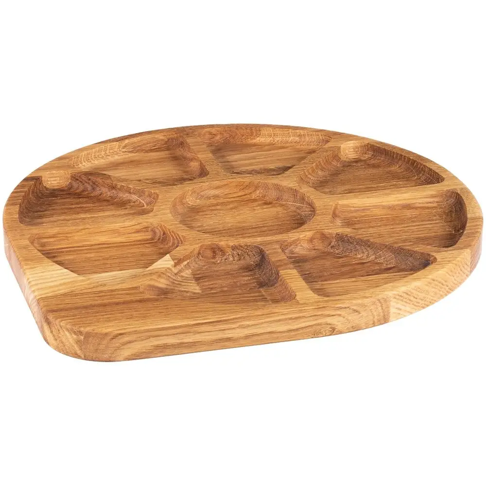 Стильная менажница — удобный аксессуар для сервировки закусок. Гостям можно одновременно подать до 9 разнообразных снеков, не занимая множеством мисочек и тарелочек целый стол.Деревянная круглая менажница предназначена для сервировки различных продуктов. Рекомендуется мыть после каждого использования, насухо вытирать и хранить в сухом месте.