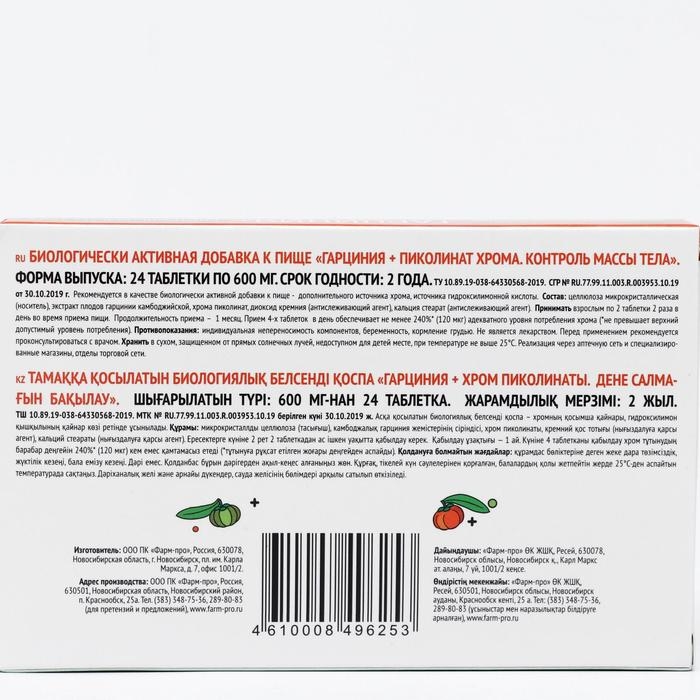Гарциния + Пиколинат хрома, контроль массы тела, 24 таблетки