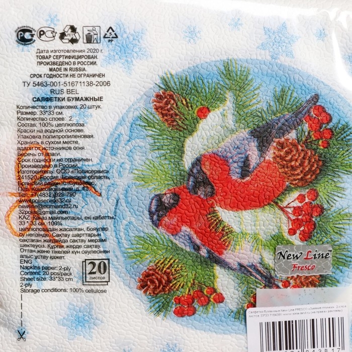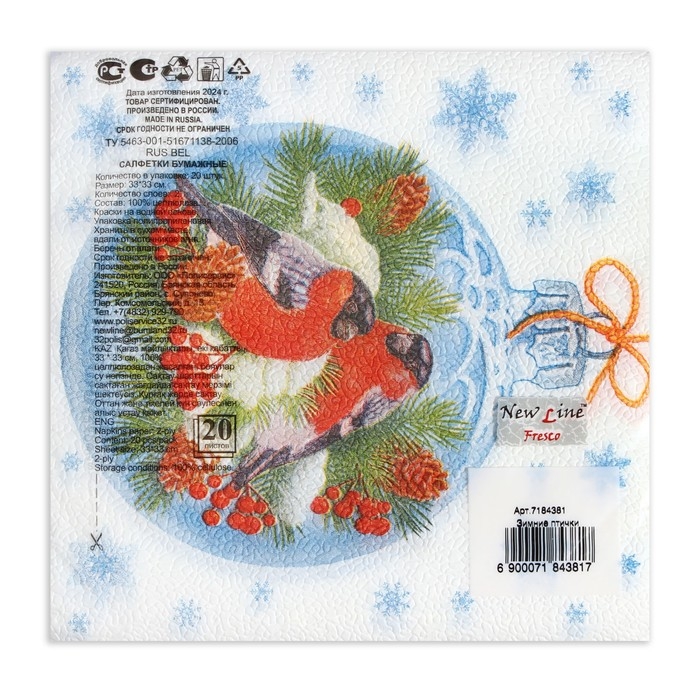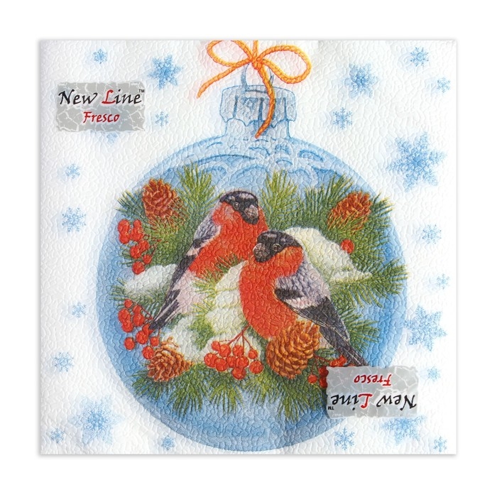 Новый год. Салфетки бумажные New Line Fresco «Зимние птички», 33х33 см, 2 слоя 20 листов