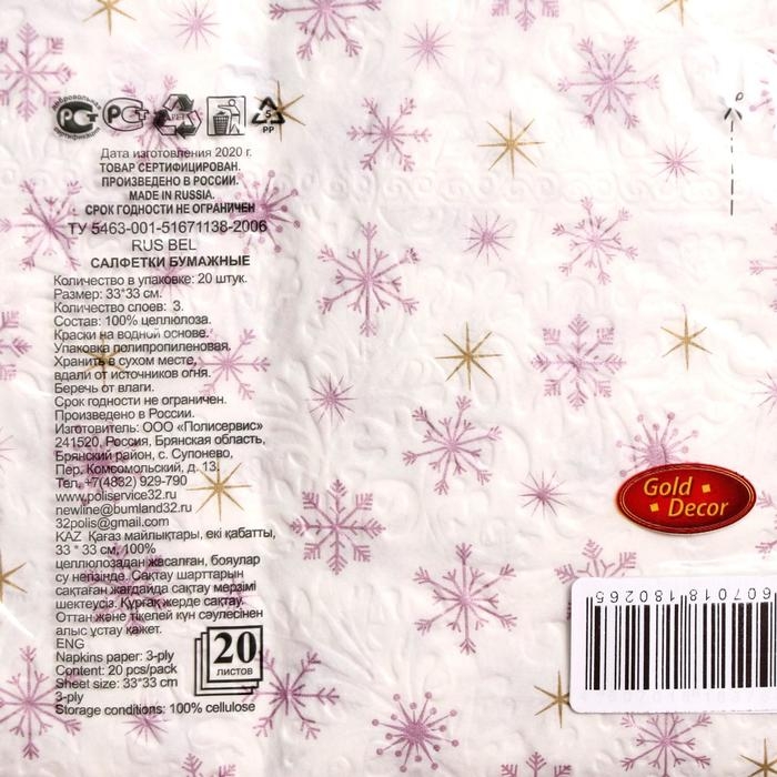 Салфетки бумажные «Снежинки», набор 20 шт., цвет золотой
