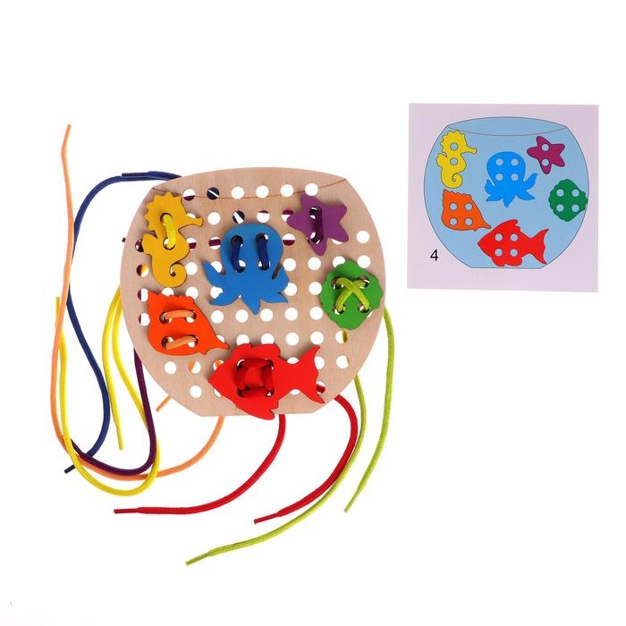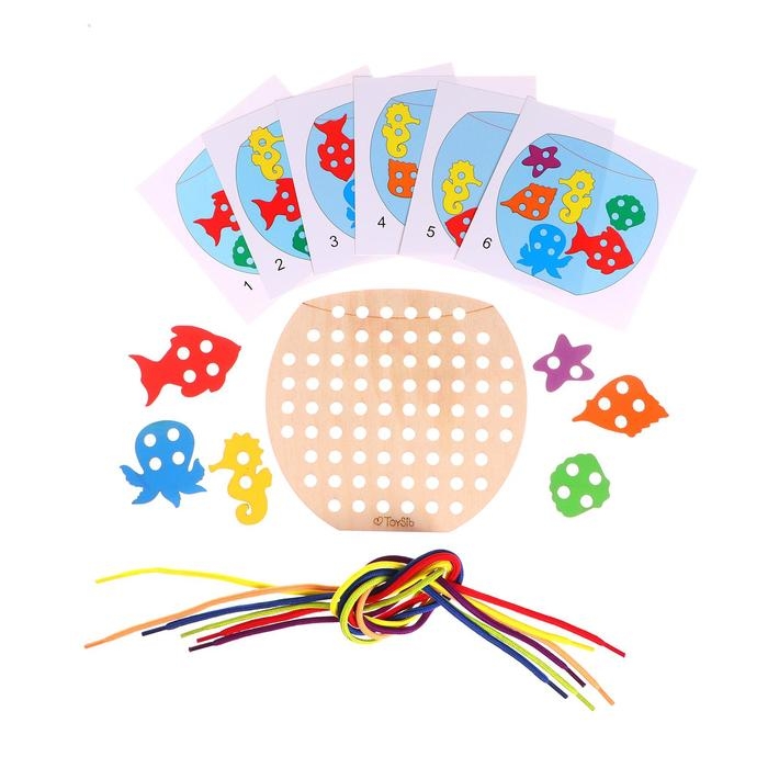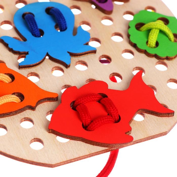 - Развивает мелкую моторику: работа с шнурком и деталями тренирует ловкость, координацию движений и точность пальцев.