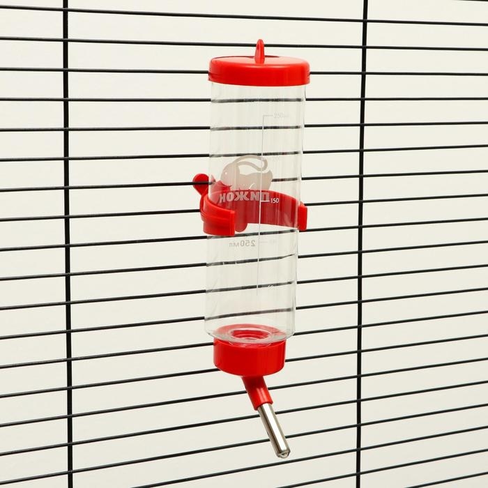 Поилка крепится между прутьев клетки, оснащена носиком из нержавеющей стали с металлическим шариком, который препятствует вытеканию воды. Поилка для клетки подходит для всех видов грызунов: хорьков ,шиншилл, хомяков, дегу, джунгариков, кроликов, крысы, мышей, морских свинок, а также для собак, щенков, кошек, котят).