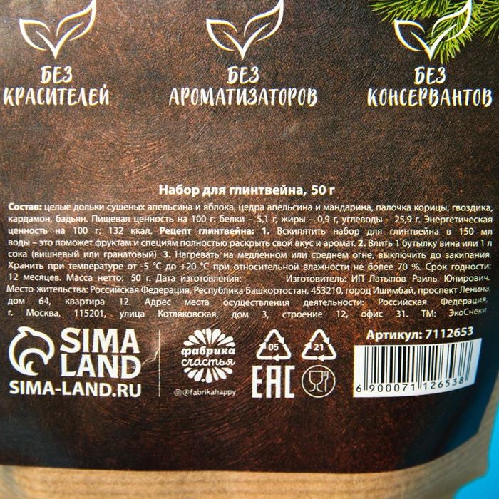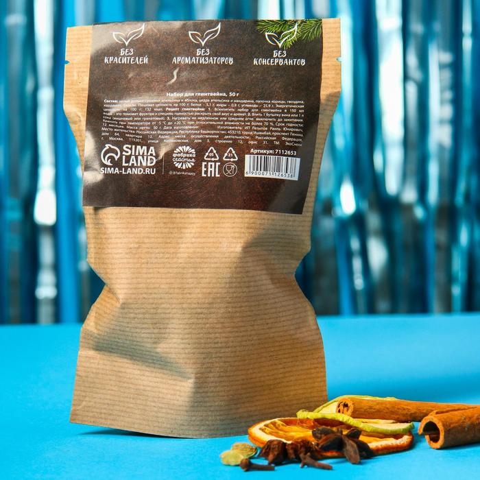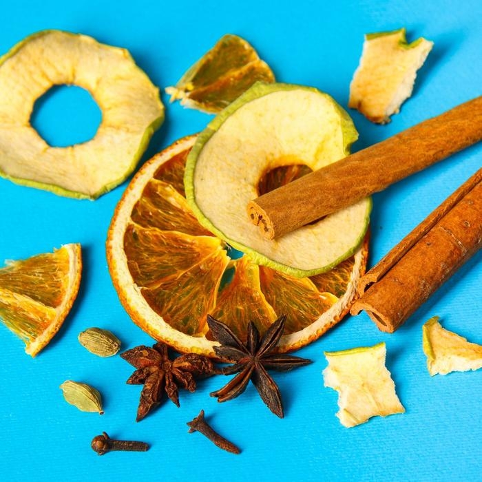 Состав: целые дольки сушеных апельсина и яблока, цедра апельсина и мандарина, палочка корицы, гвоздика, кардамон, бадьян.