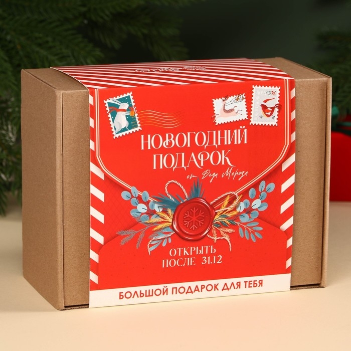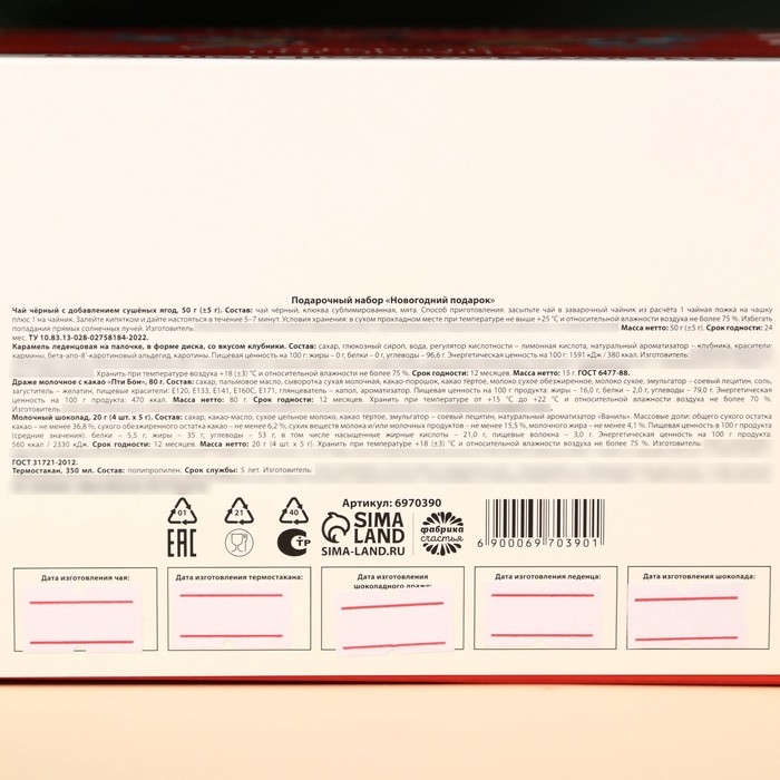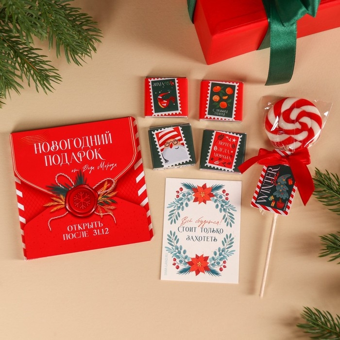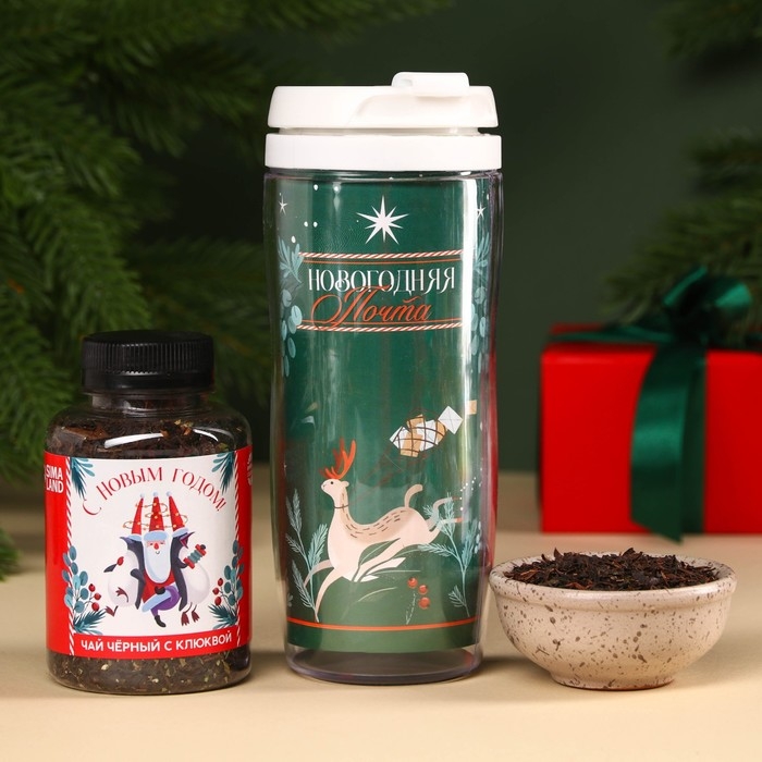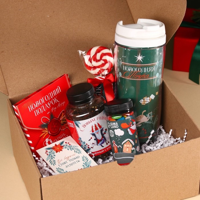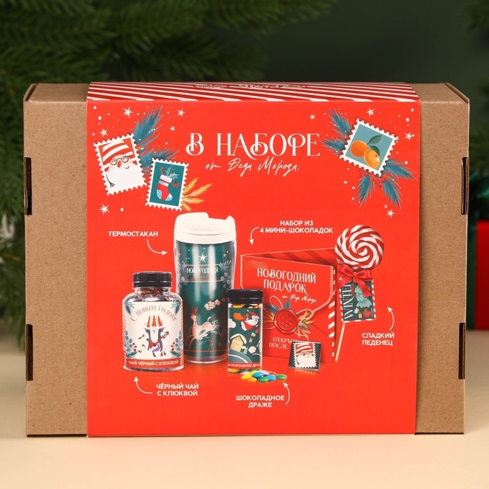Гифтбокс «Новогодний подарок», чай, драже, шоколад, термостакан, леденец