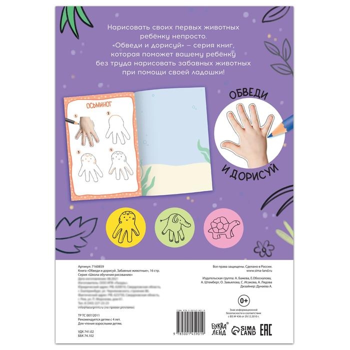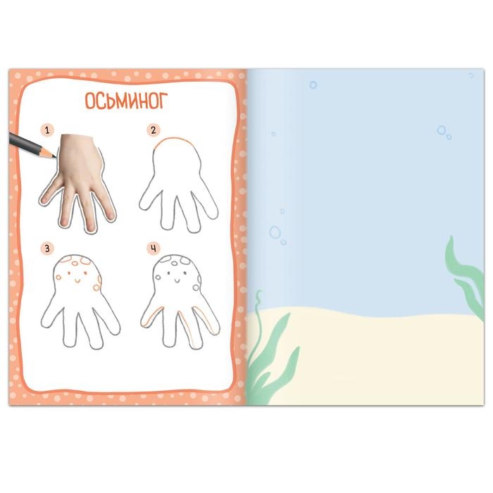 Книга поможет ребёнку легко и быстро научиться рисовать животных. Для этого малышу достаточно обвести свою ладошку! На страницах книги есть пошаговые инструкции, как обведённую ладошку превратить в кошечку, осьминога или других персонажей.