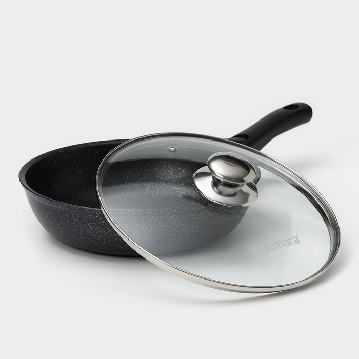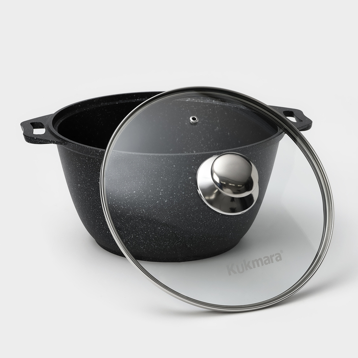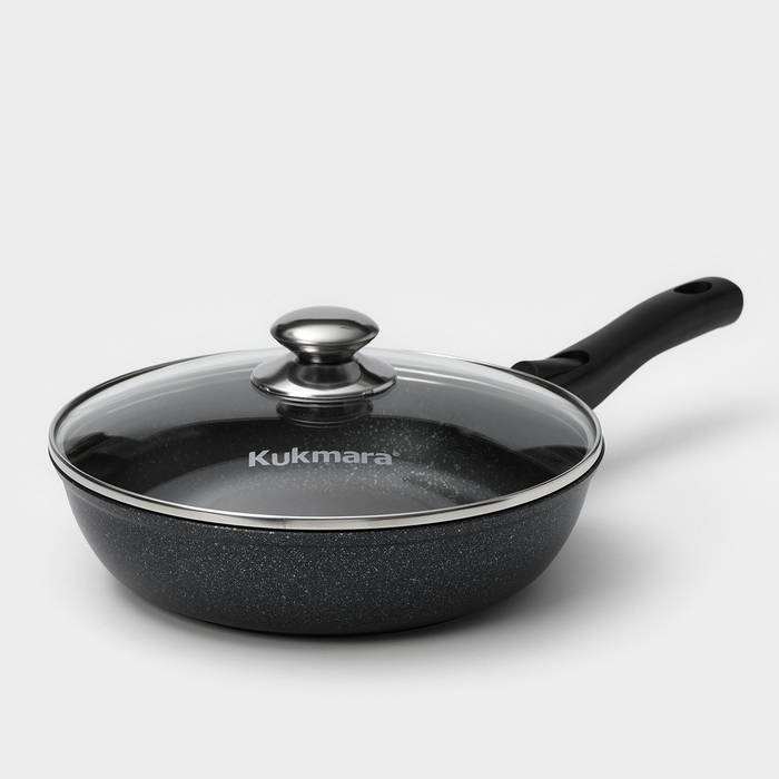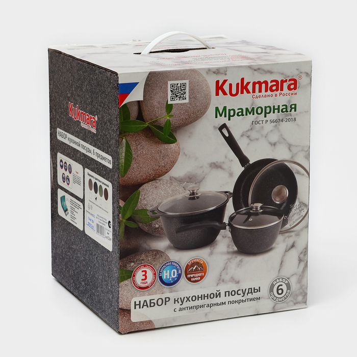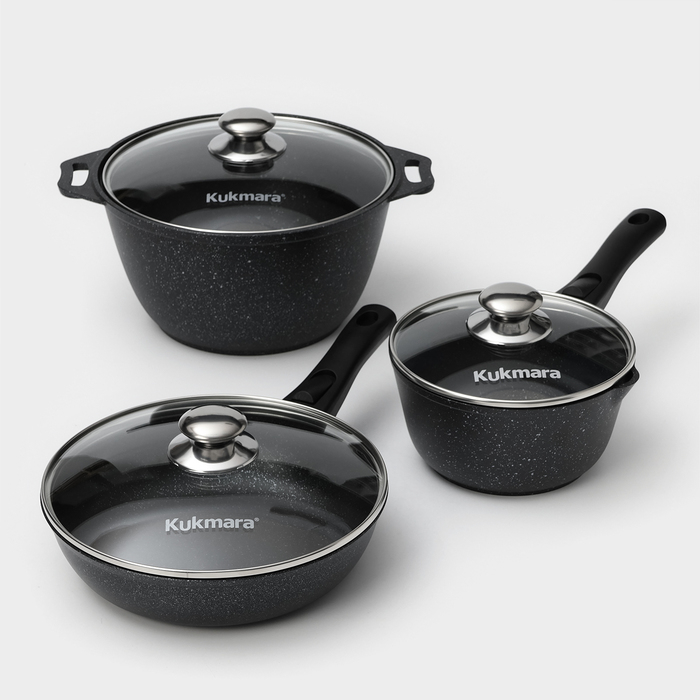 Посуда Kukmara сделана из литого алюминия. Имеет инновационное антипригарное мраморное покрытие нового поколения, которое изготовлено на водной основе по немецкой технологии (Weilburger Coatings GmbH) и усилено сверхтвёрдыми частицами минералов.