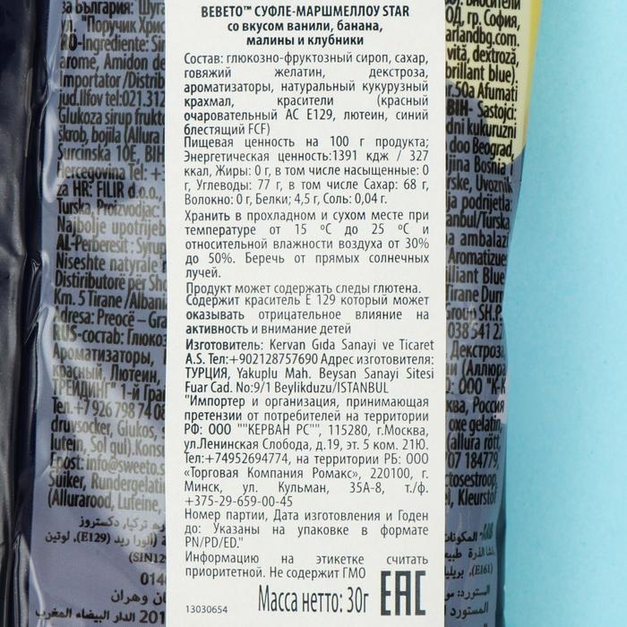 Суфле Маршмеллоу "STAR" – это нежные и воздушные маршмеллоу в форме звёзд, которые завораживают своим сладким вкусом. Наслаждайтесь изысканным сочетанием ванили, банана, малины и клубники, которое подарит вам невероятное удовольствие.