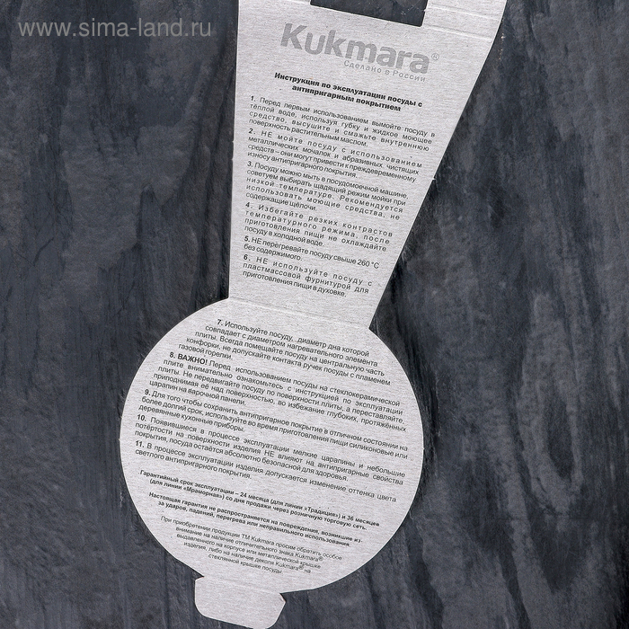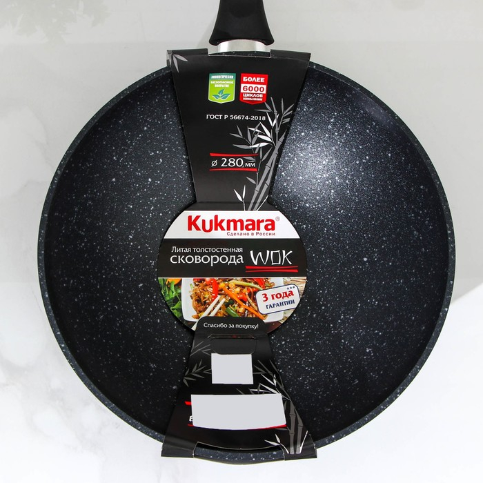 Посуда Kukmara «Мраморная» изготовлена из литого алюминия и покрыта инновационным антипригарным мраморным покрытием на водной основе, усиленным сверхтвёрдыми частицами минералов.