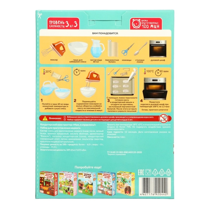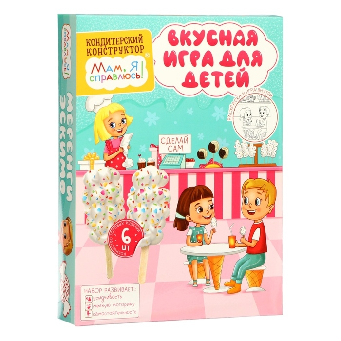 Кондитерский конструктор Мам, я справлюсь! меренги эскимо. Набор для приготовления в домашних условиях кондитерских изделий. Кондитерский конструктор-отличная идея, как занять детей увлекательным процессом приготовления настоящих шоколадных леденцов. Состав набора изготовлен из натуральных ингредиентов. Процесс приготовления позволит ребенку быть в роли производителя вкусного лакомства. Кондитерский конструктор - возможность преподнести подарок, сделанный своими руками. На внутренней стороне упаковки нанесена раскраска и игра, которые позволят увлечь вашего ребенка еще на некоторое время :)