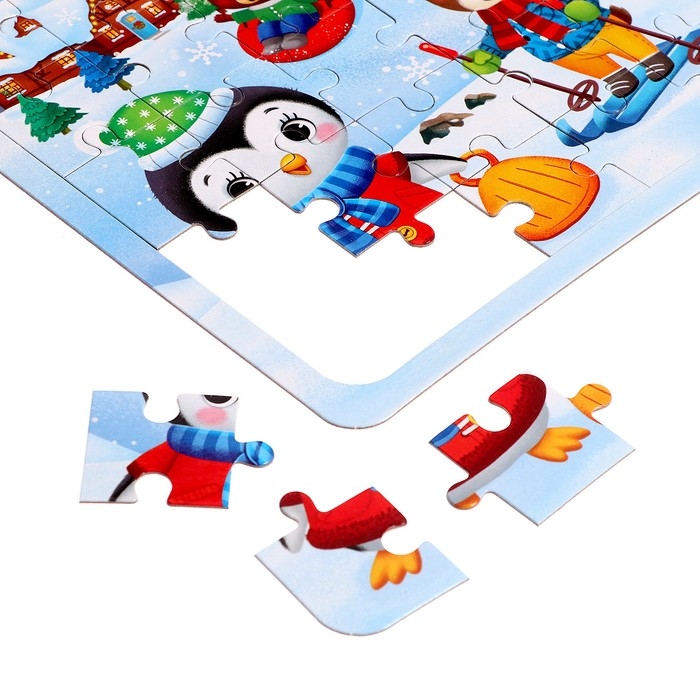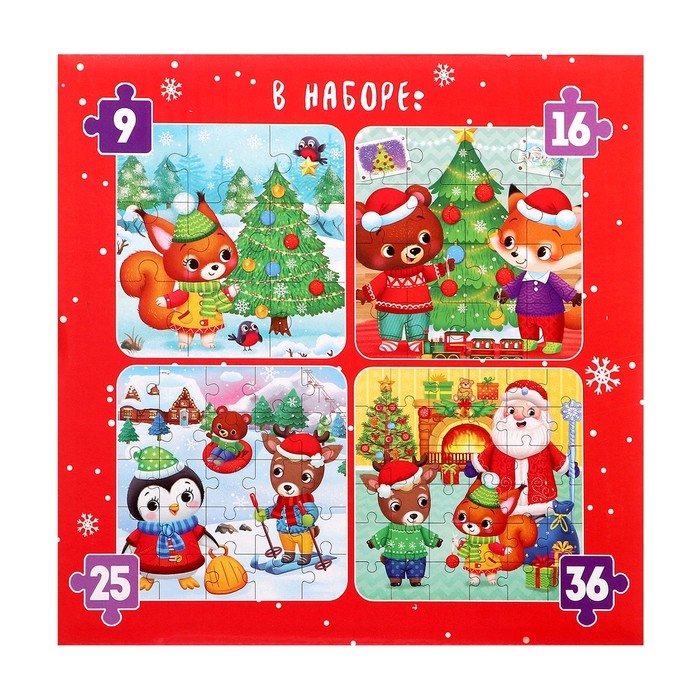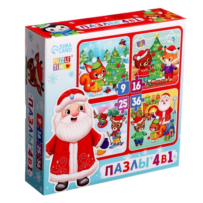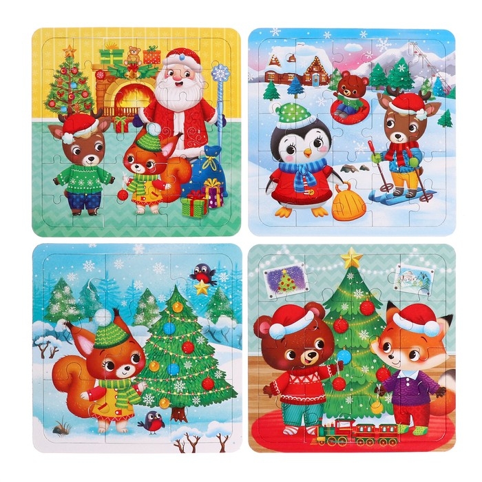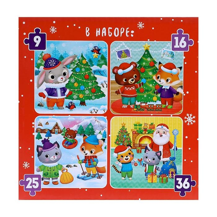 Пазлы 4 в 1 «Новый год у зверят», 9, 16, 25, 36 элементов