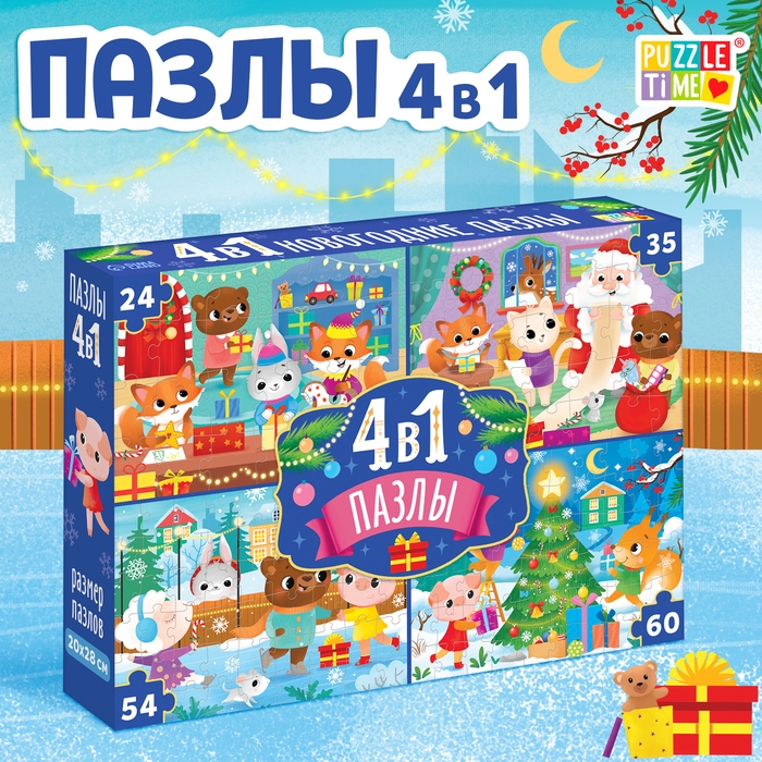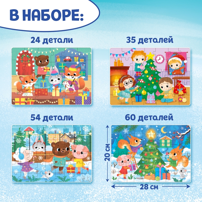 Пазлы 4 в 1 «К нам приходит Новый год», 24, 35, 54, 60 элементов