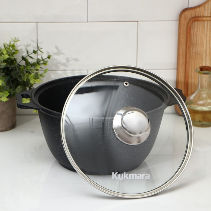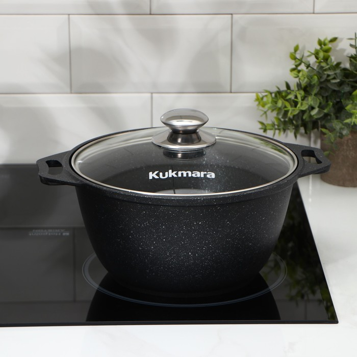 Кастрюля Kukmara сделана из литого алюминия. Имеет инновационное антипригарное мраморное покрытие на водной основе, которое изготовлено по немецкой технологии (Weilburger Coatings GmbH) и усилено сверхтвёрдыми частицами минералов.