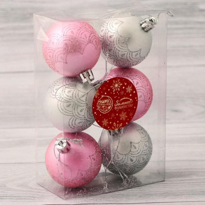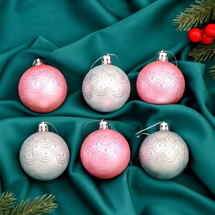 Набор шаров пластик d-5 см, 6 шт "Глэдис узоры" серебристо-розовый