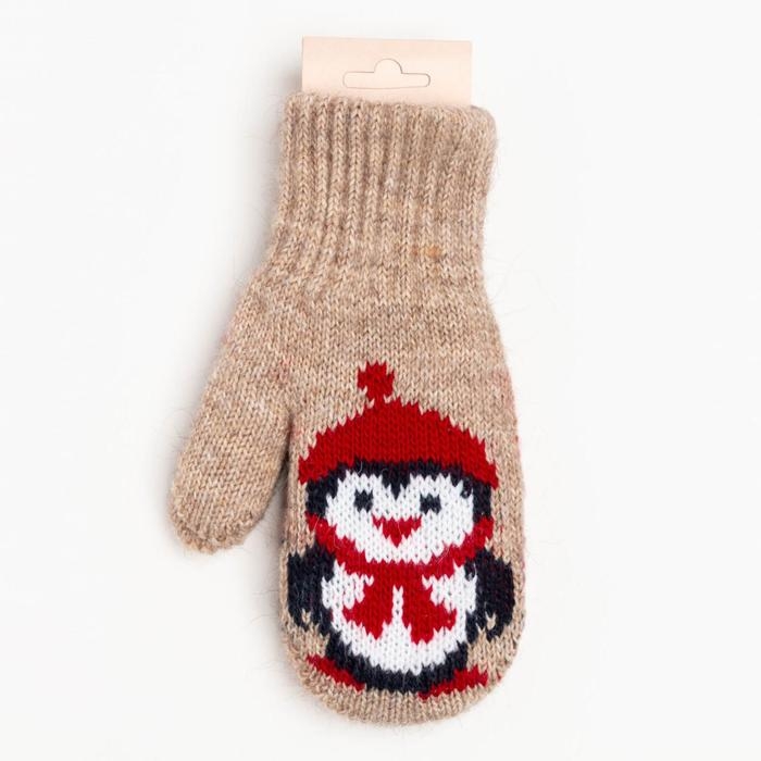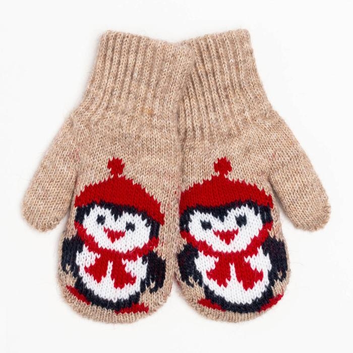 Новый год. Варежки двойные детские, цвет бежевый/пингвин, размер 16 (9-12 лет)