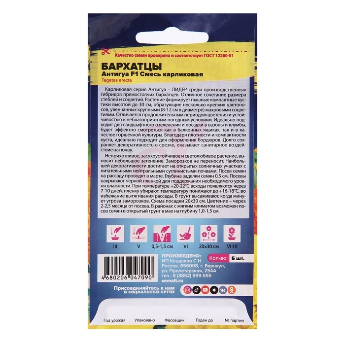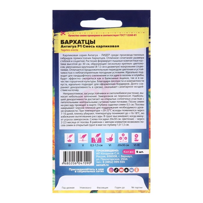 Семена цветов Бархатцы Антигуа, смесь карликовая, Сем. Алт, ц/п, 5 шт