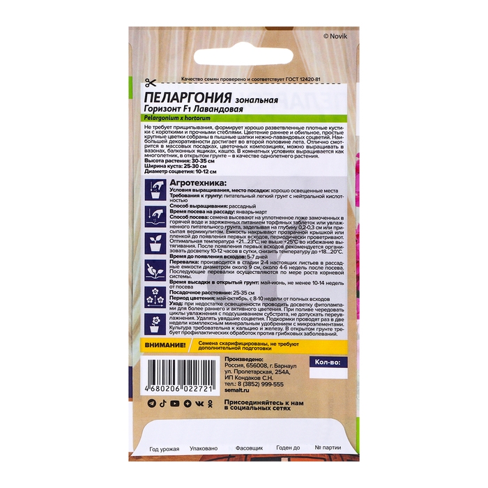 Семена цветов Пеларгония "Горизонт", "Лавандовая", Сем. Алт, ц/п, 4 шт