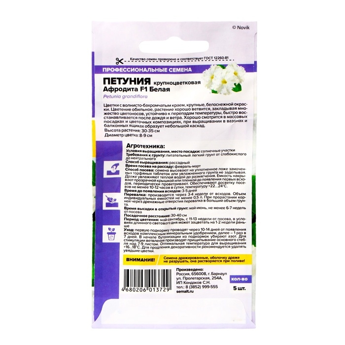 Серия «Афродита» - группа гибридных крупноцветковых петуний с волнистыми и бахромчатыми краями цветков. В пору цветения представляет собой грандиозную картину – одинаковые по размеру пышные кустики, с высотой габитуса до 35 см, несут множество крупных, диаметром 8-9 см, гофрированных белоснежных цветков, не теряющих декоративность в течение всего сезона. Особенно привлекательна коротким периодом выращивания, пышным продолжительным цветением и выносливостью. Её можно успешно выращивать даже при неблагоприятных климатических условиях. Широко используется как для посадок в цветники, так и в качестве горшечной культуры. Выращивают на клумбах в ярких групповых посадках, в бордюрах, рабатках, подвесных корзинах. При посадке в цветочные ящики растения образуют небольшой каскад. Обильное цветение с июня до заморозков. Светолюбивое и достаточно засухоустойчивое растение. Предпочитает легкие плодородные, хорошо дренированные почвы. Посевы на рассаду проводят с середины февраля. Семена равномерно распределяют по поверхности субстрата, не заделывая, а лишь слегка вдавливая в грунт. Для получения наилучшего результата посев рекомендуем проводить в торфяные таблетки (одно драже в таблетку). Посевы увлажняют из распылителя и накрывают стеклом для поддержания постоянной влажности. Емкость помещают в светлое теплое место (+22-24°С). Всходы появляются через 10-15 дней, стекло убирают. Февральским посевам требуется дополнительная подсветка. Пока всходы мелкие, их лучше не поливать, а опрыскивать, избегайте попадания на них прямых солнечных лучей. Пикировку проводят в фазе 1-2-х настоящих листочков. В открытый грунт рассаду высаживают в конце мая - начале июня, когда минует угроза возвратных заморозков. Посадочный интервал – 30-40 см. Возможно сохранение растений зимой в освещенном помещении при температуре около +12°С с предварительной обрезкой побегов. Внимание! Семена дражированные - оболочку драже не разрушать!