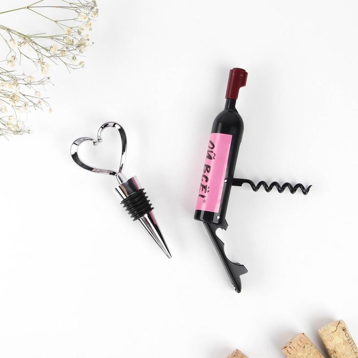 Штопор полезное и удобное приспособление для быта и просто необходимый предмет. Штопор имеет два рычага с помощью которых вы легко сможете вытащить пробку из бутылки. Пробка для бутылки используется для плотного закрытия горлышка. Данный набор станет отличным подарком на любой праздник.