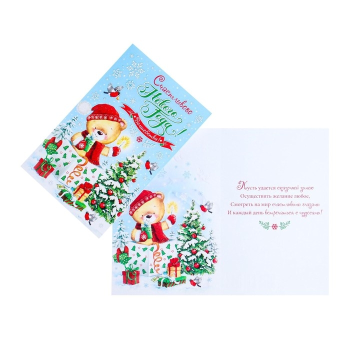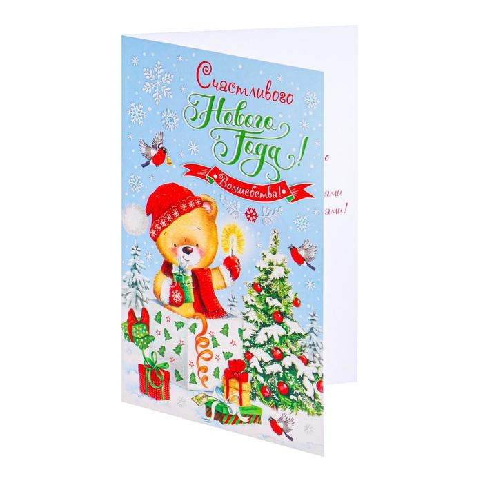 Открытка "С Новым Годом!" мишка, бенгальский огонек, конгрев, глиттер